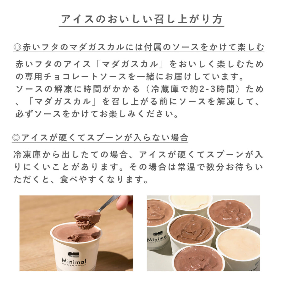 - 赤いフタのアイス「マダガスカル」をおいしく楽しむための専用チョコレートソースを一緒にお届けします。ソースの解凍に時間がかかるため、召し上がる前に解凍して、必ずソースをかけてお楽しみください。