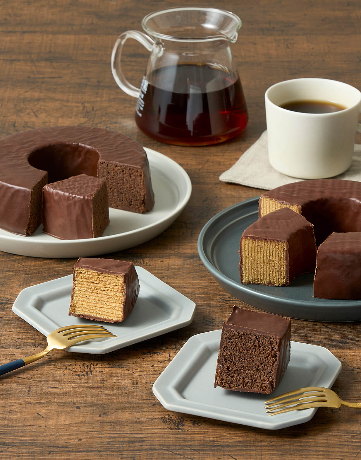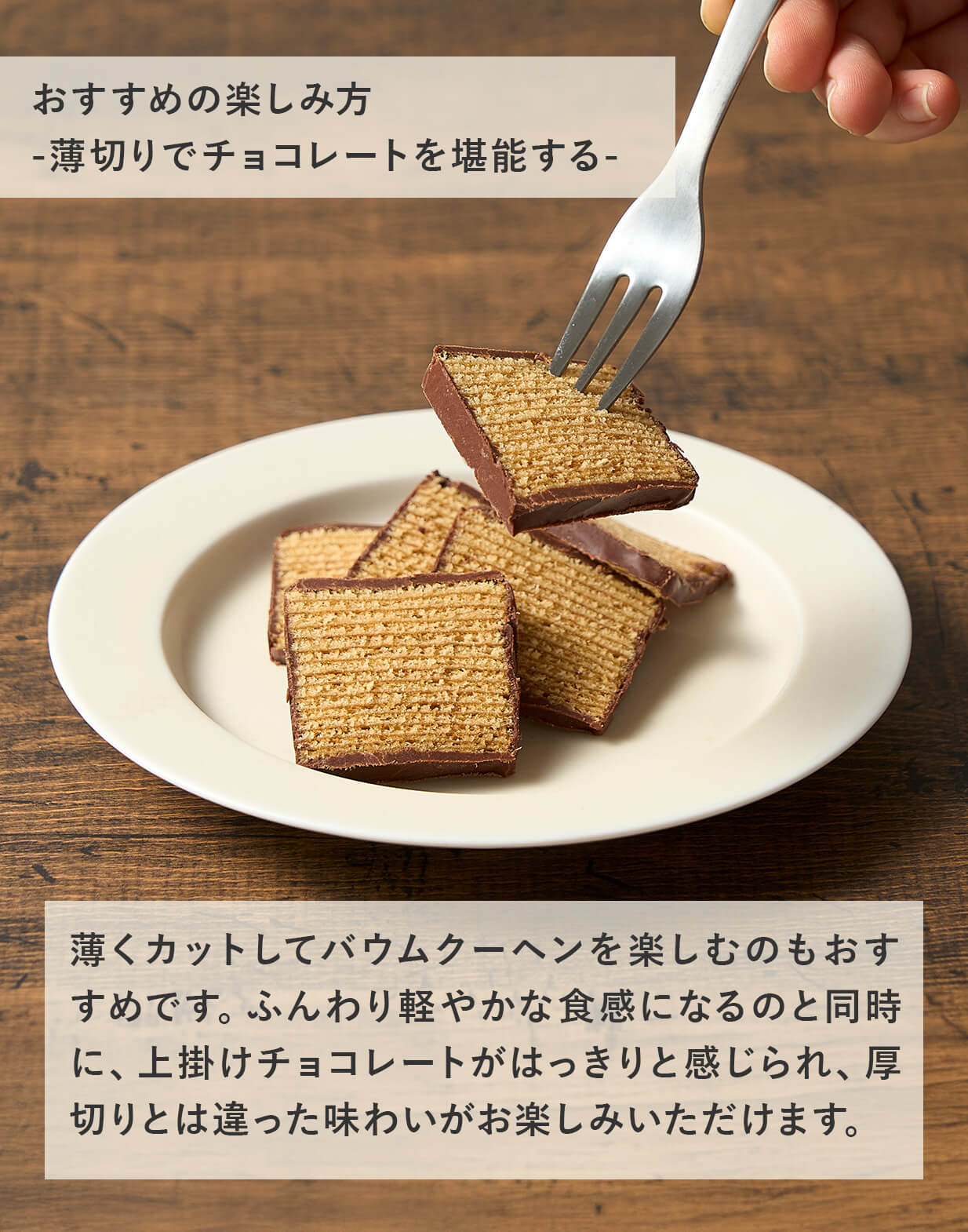 生地と上掛けチョコレートのバランスを調整し、単なる濃厚なチョコレートだけの味わいではなく、思わずもう一口手が伸びる、心地よいバランスのチョコレートバウムクーヘンです。