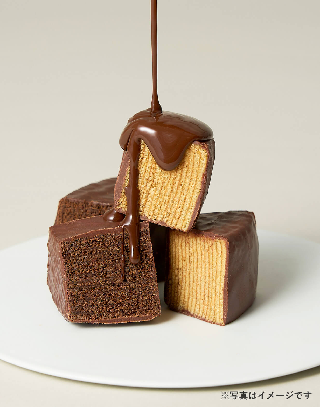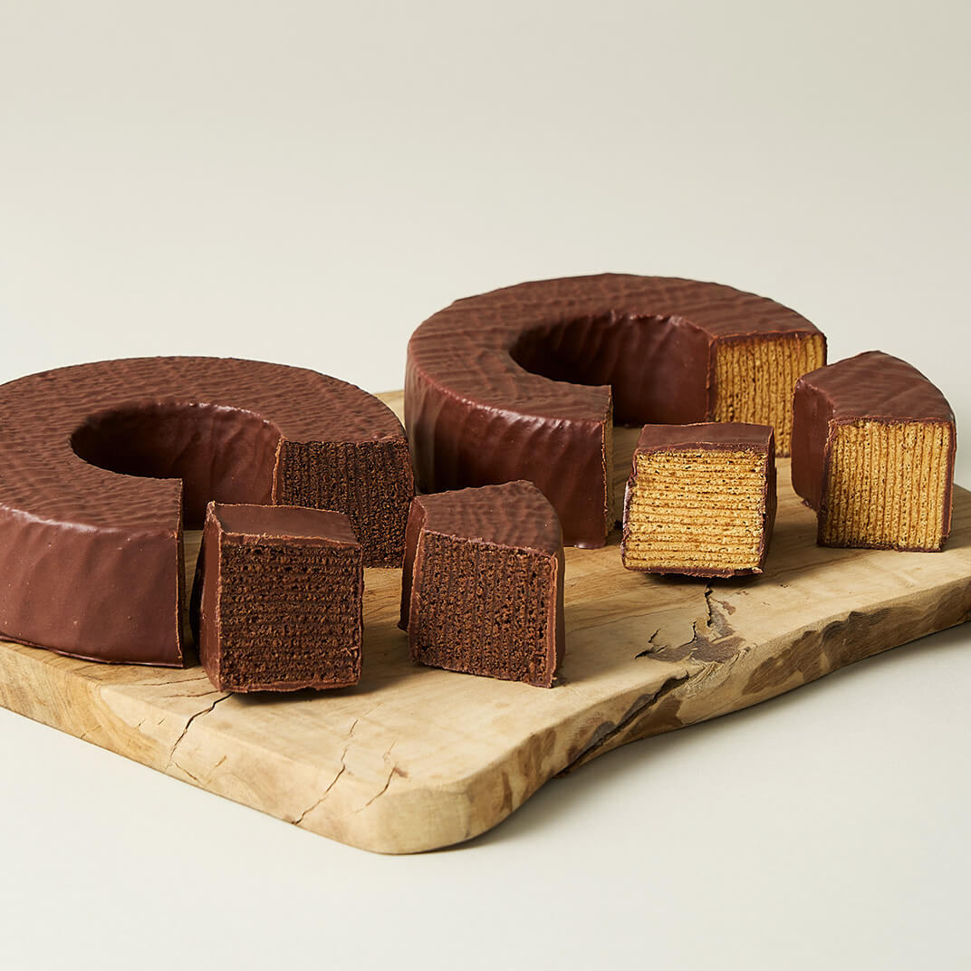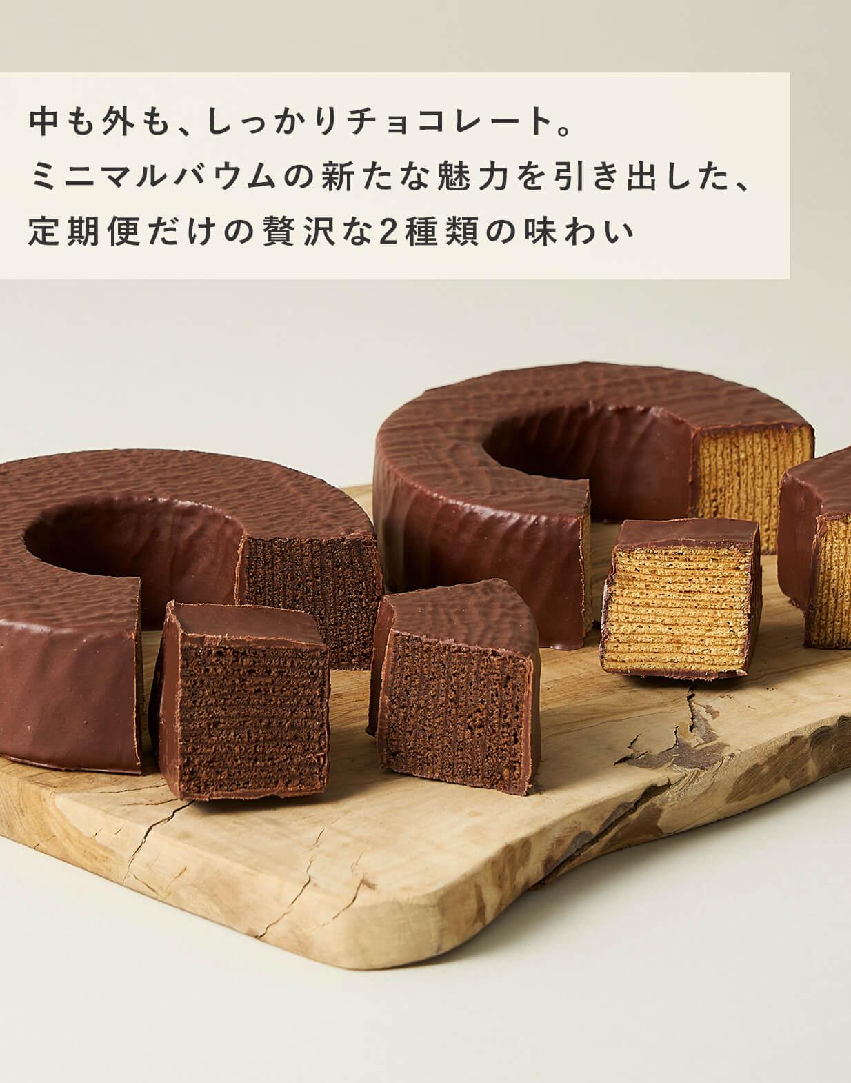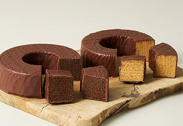 チョコレートを生地にたっぷりと混ぜ込んだミニマルバウムに、さらにチョコレートをまとわせた“チョコレートづくし”のバウムクーヘンセットです。