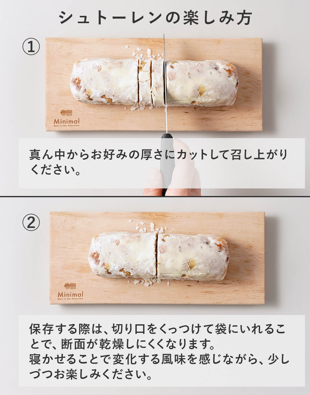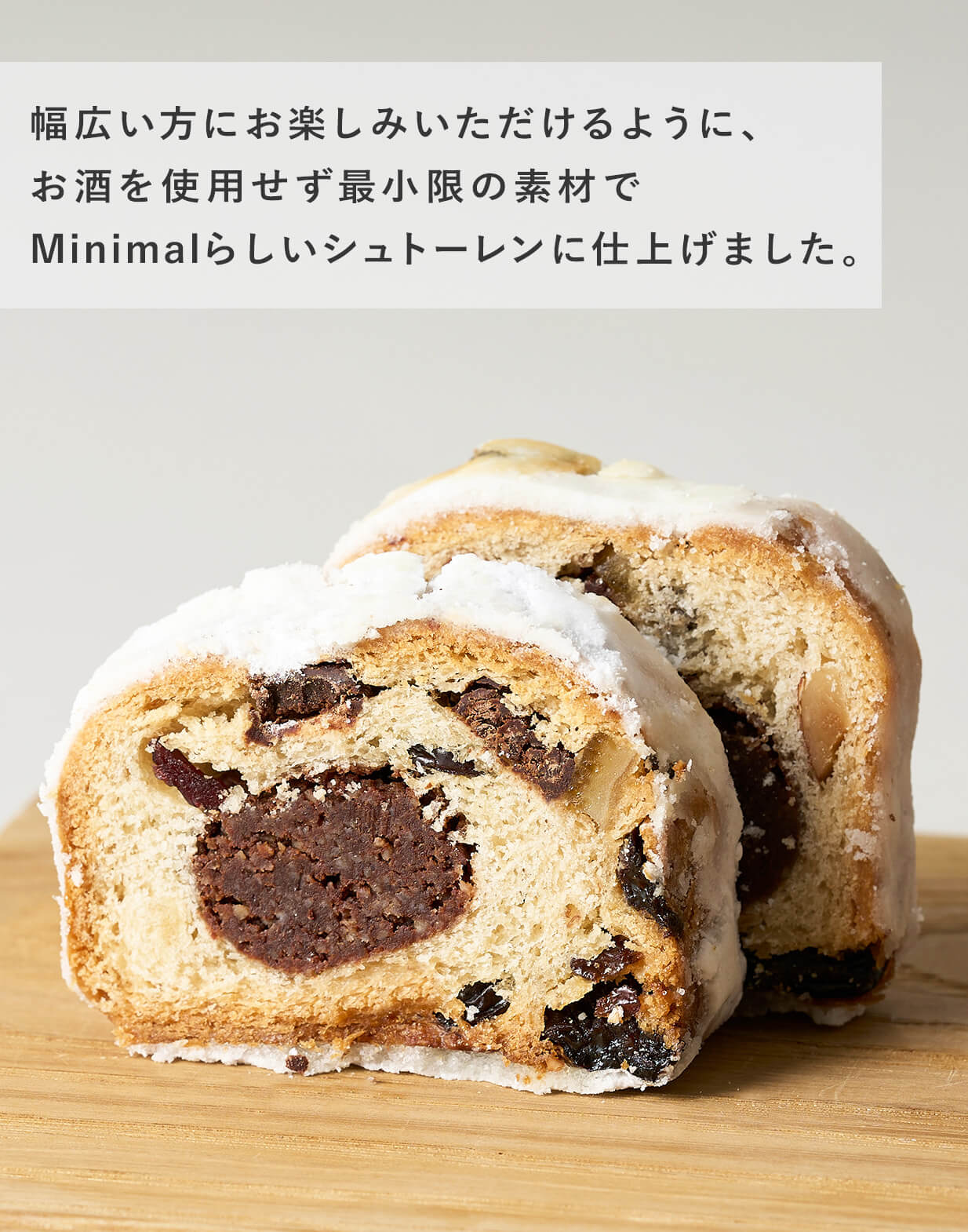 昨年ご好評いただいた、Minimalらしいシンプルでカカオの風味豊かなシュトーレンを、バージョンアップしてお届けします。
