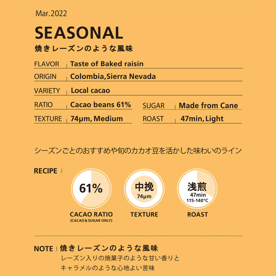 焼きレーズンのような風味Minimalのチョコレートの中でもファンが多い、コロンビア・シエラネバダ産のカカオ豆を使用してます。主なキャラクターはレーズンのような凝縮した甘味のある果実味です。そこに焼き菓子のような甘い香り、キャラメルのような心地良い苦味が加わることで、焼きレーズンのような風味に仕上げました。 |