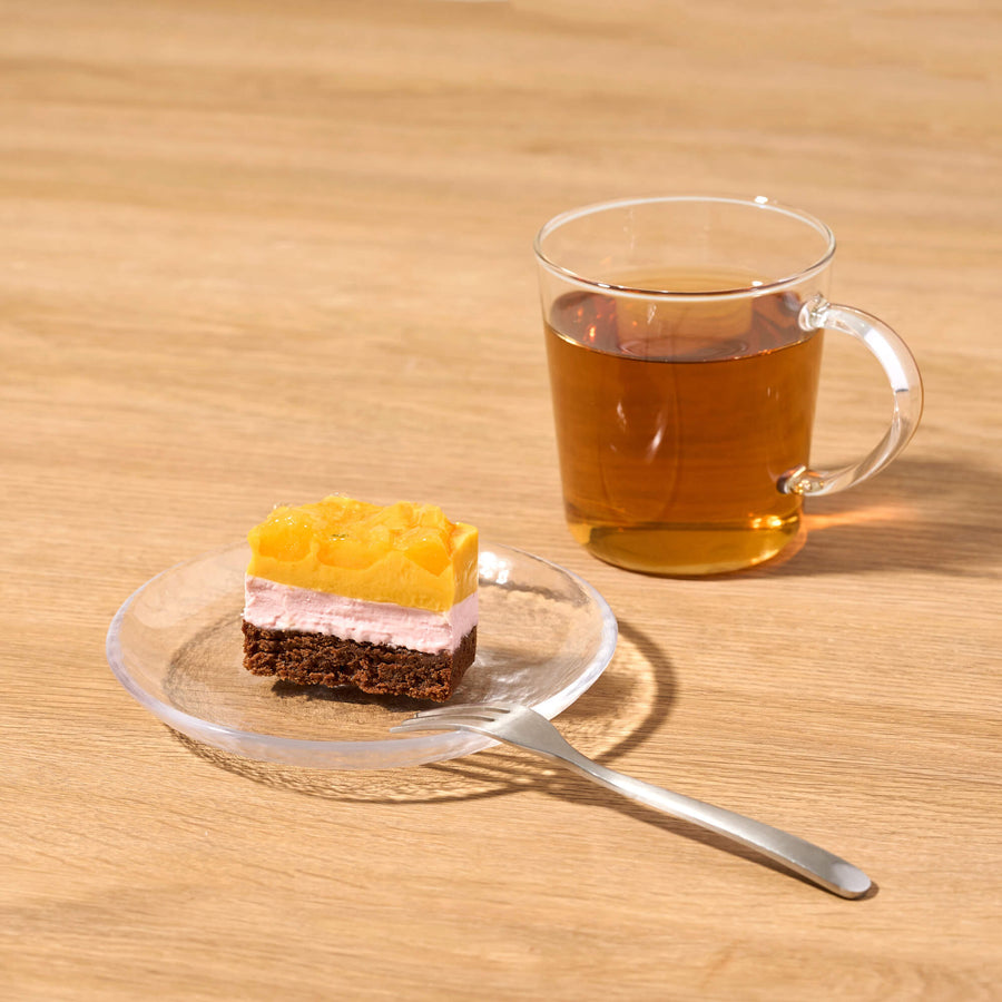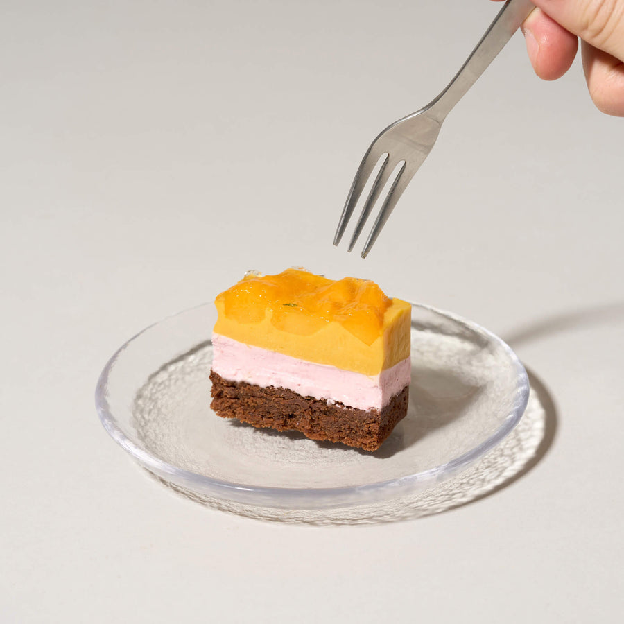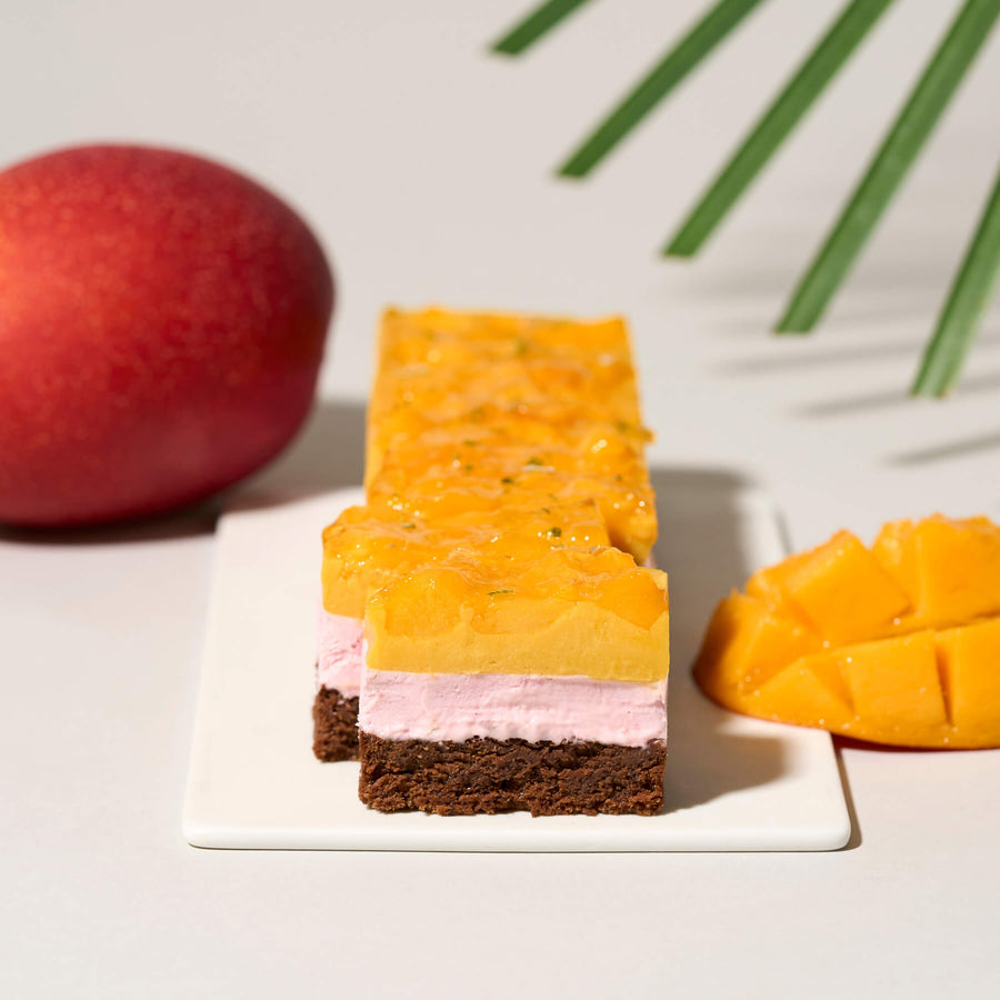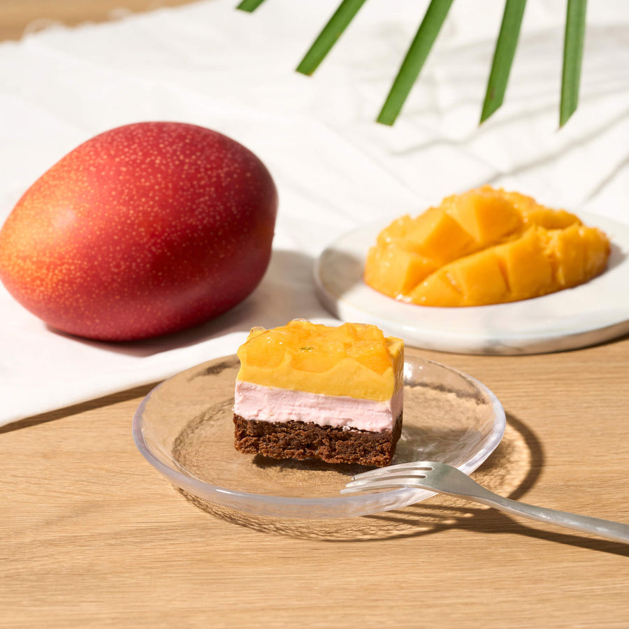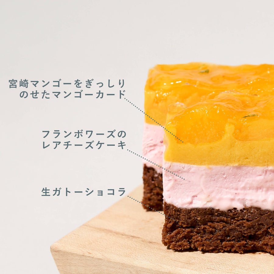 濃厚なマンゴーを引き立てる、爽やかなフランボワーズのレアチーズケーキ上層にはピューレ状にしたなめらかで濃厚な味わいのマンゴーカードの上に、フレッシュなマンゴーを贅沢にたっぷりのせ、完熟マンゴーそのものの味わいを存分にお楽しみいただけるよう仕上げています。中層に淡いピンク色のフランボワーズのレアチーズケーキを重ね、マンゴーの甘さと調和しながら、爽やかな印象を生み出します。 |