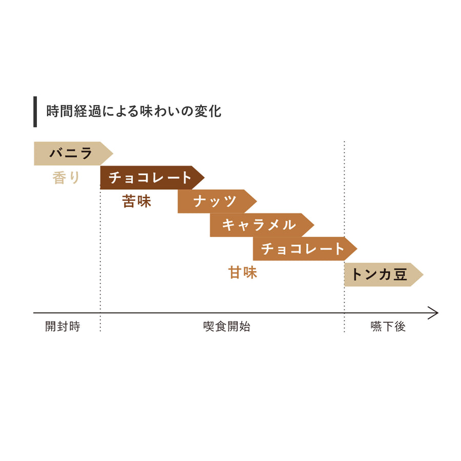 ミルクチョコレートらしい満足感と、豊かで心地よい余韻ガーナ産とハイチ産のカカオ豆をブレンドし、バニラを加えることで、ミルクチョコレートらしいしっかりとした甘味と苦味を両立。そこにミルク由来のキャラメルのような香ばしさが重なることで、満足感のある味わいが広がります。 |
