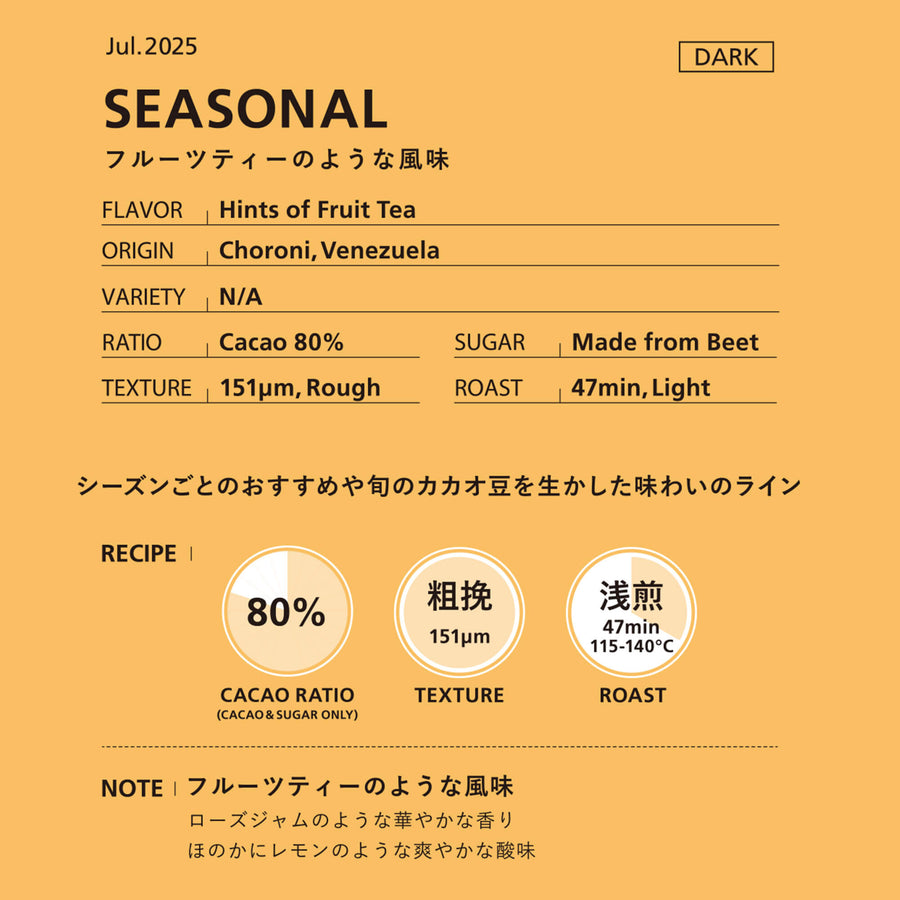 華やかでフルーティ、夏でも食べやすい高カカオチョコレートベネズエラ・チョロニ産のカカオが持つ、果実感とフローラルといった華やかなキャラクターを引き出し、カカオ濃度80%ながらも、フルーツティーのような華やかで果実味を感じるチョコレートに仕上げました。 |